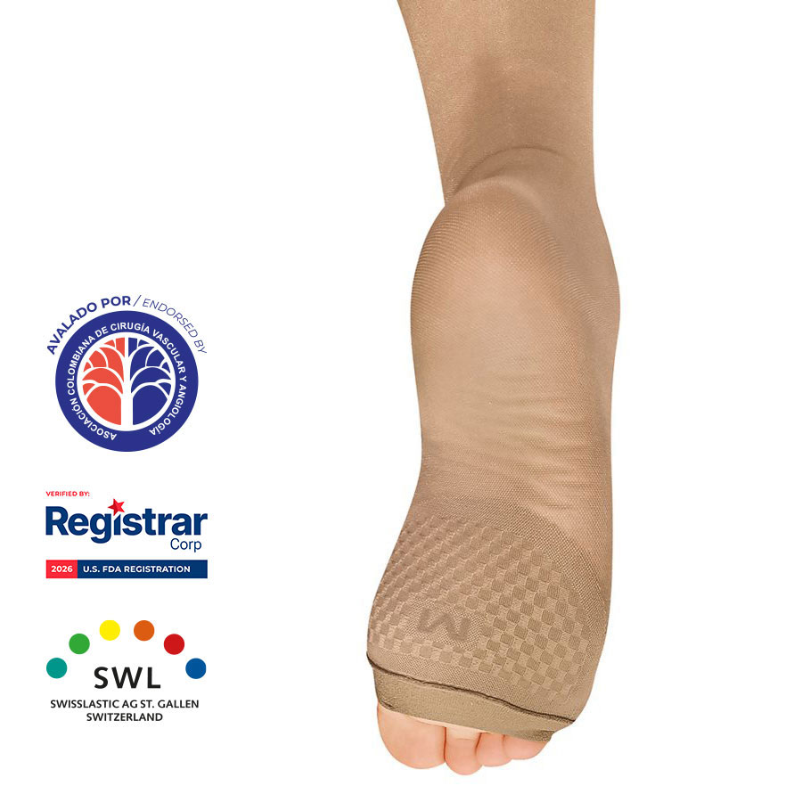 Diseñadas como dispositivos médicos tipo 1, estas medias ejercen compresión externa para reducir el diámetro de las venas y mejorar la presión en ellas. La compresión se aplica de manera gradual desde el tobillo hasta la rodilla o la cadera.