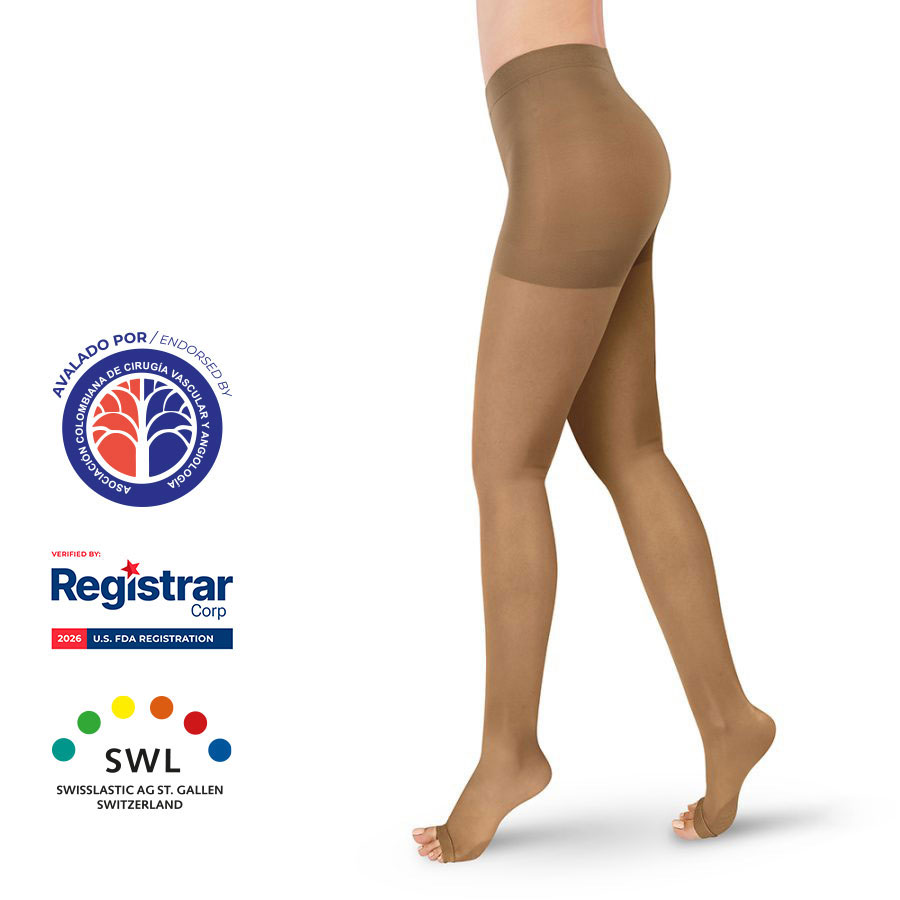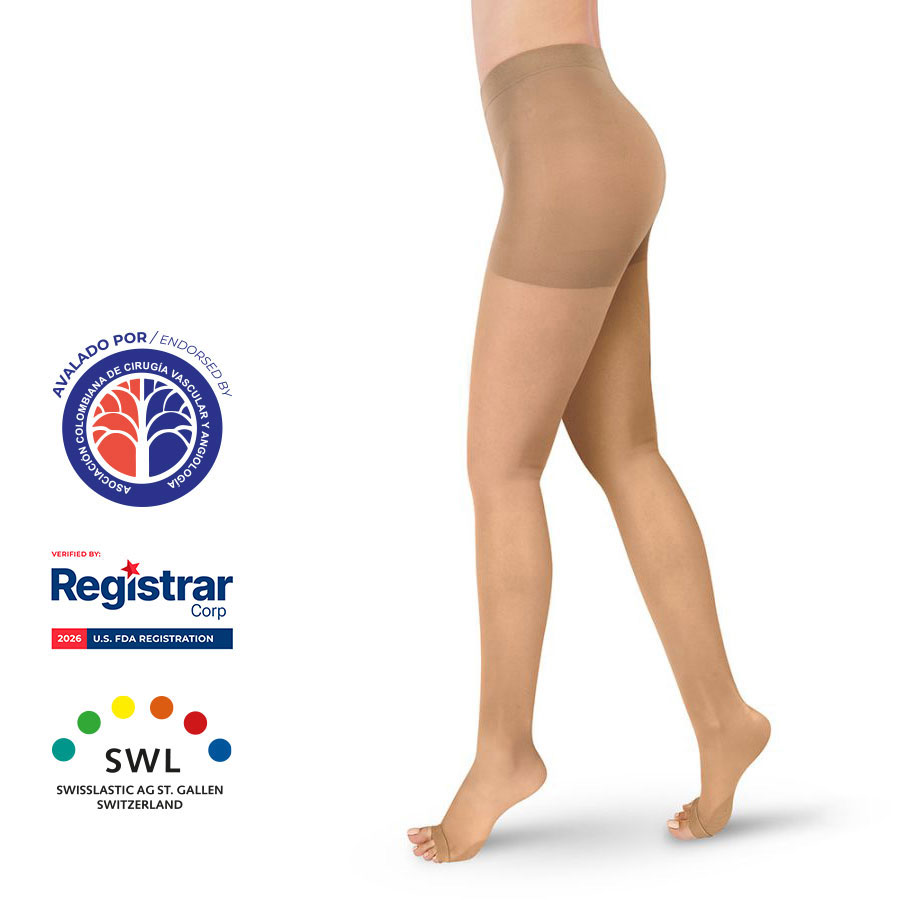 Estas medias de compresión graduada están en el nivel de mayor compresión de 20 a 30 mmHg, y vienen en la presentación de media a la cadera o pantimedia.