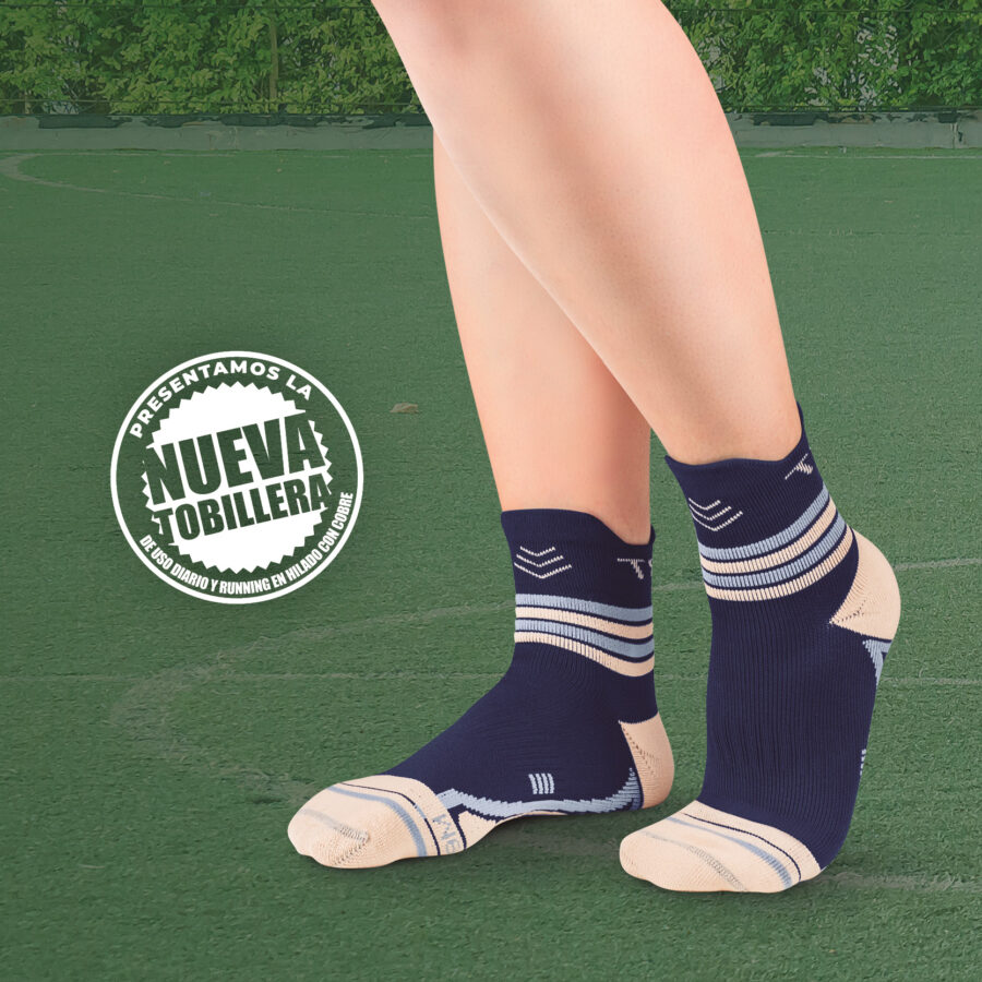 Fabricada con tecnología en nanopartículas de cobre, ofrece estabilidad al tobillo gracias a su tejido en forma de anillos y una banda integrada que alivia los síntomas de la fascitis plantar
